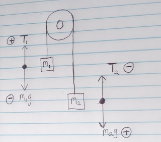 T1 + m2g - m1g - T2 = m1a1 + m2a2